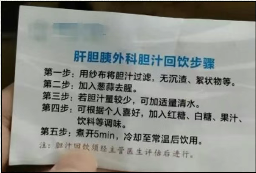 图1 胆汁回饮步骤喝下自己的胆汁?“医生让我喝自己的胆汁!”——这绝非猎奇小说桥段,而是肝胆外科病房的真实医嘱。当患者目睹金黄色的胆
