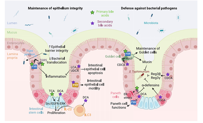 胆汁酸与肠道菌群的双向奔赴肠道菌群和胆汁酸之间的作用是双向的、互惠的,对维持正常的生理功能至关重要。肠道菌群会影响胆汁酸的合成、代