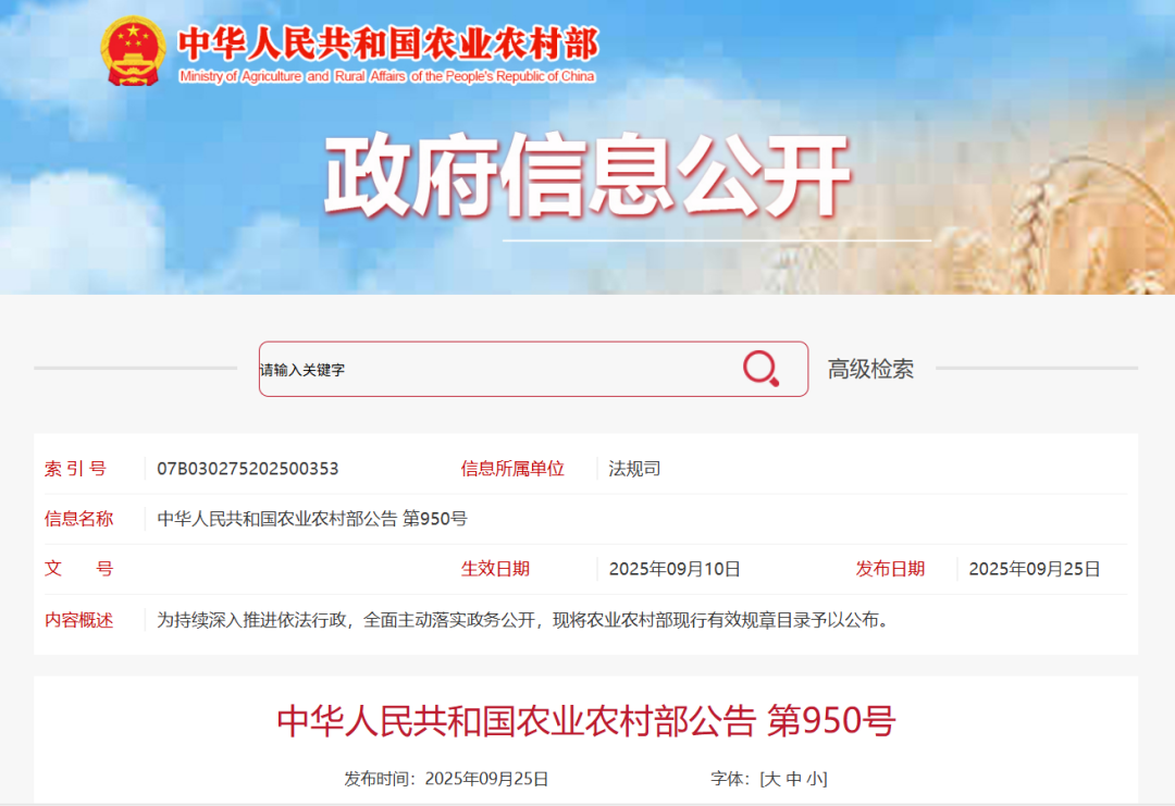 为持续深入推进依法行政,全面主动落实政务公开,现将农业农村部现行有效规章目录予以公布。农业农村部2025年9月10日农业农村部现行有效规