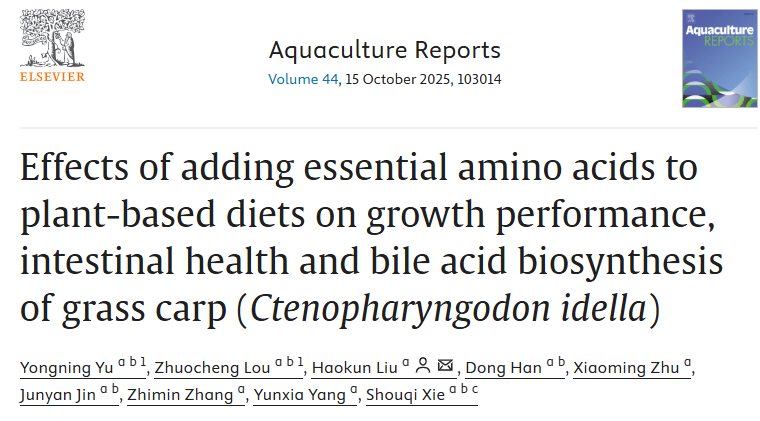 摘要高植物蛋白饲料可能对水产养殖品种的生长和健康存在一定限制。本研究通过基于氨基酸平衡原理在草鱼饲料中添加必需氨基酸,探究其对缓解